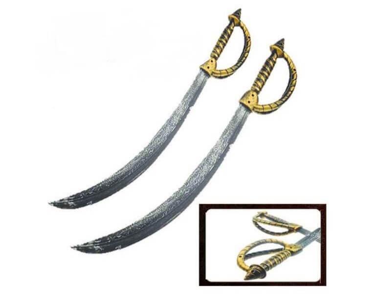 Комплект включає відразу дві піратські шаблі значного та ефектного розміру - по 65 см кожна. Модель відрізняється злегка зігнутою формою клинка, виразним «застарілим» зовнішнім виглядом та рукоятками з подвійним ефесом, виконаними у стилі старовинної бронзи. На поверхні леза є імітація тріщин і слідів часу, що надає аксесуару додаткову реалістичність і характер.
